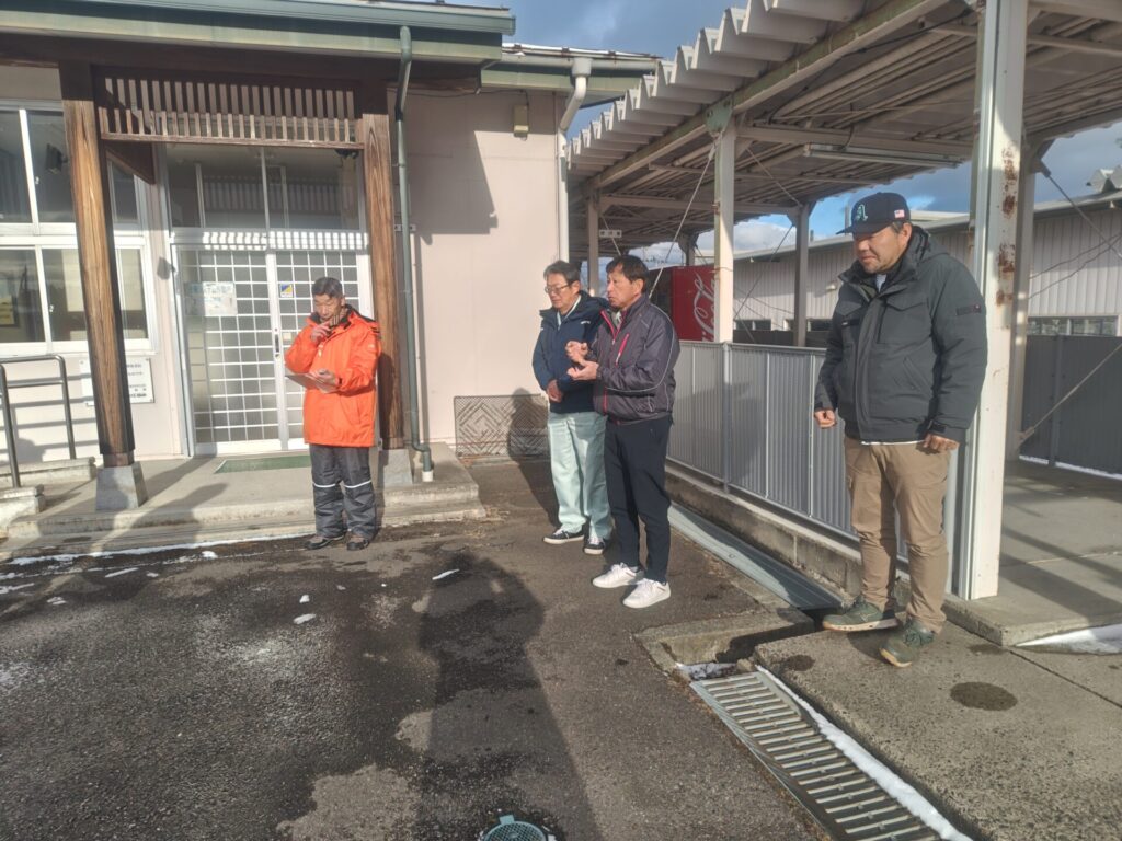 この日はとても気温が低く、朝は路面が凍結している状態でしたが、朝早くから受講者および講師の方々にお集まりいただき、時間通り開講式を行いました。草野専務から今日の講習会の手順、注意点等の説明がありました。