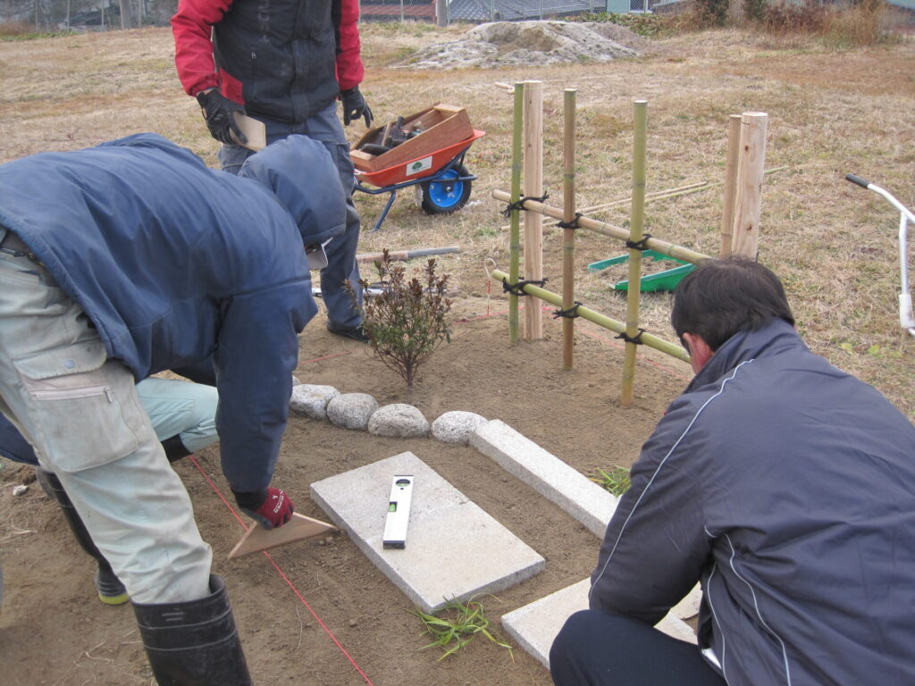 製作等試験は、指定された区画内に施工図の通りに庭を製作し、基準を満たしたものが合格となります。受講者のみなさんは「令和7年度版3級造園技能検定受検の手引き」を基にし講師からアドバイスを受け施工方法を学びました。