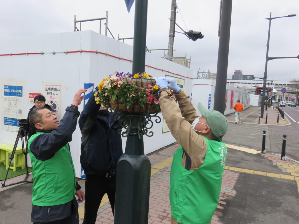 場所はJR福島駅前から街なか広場まで歩道両側の街路灯で、設置期間は6月下旬ごろまで。7月には夏の花に入れ替えする予定です。